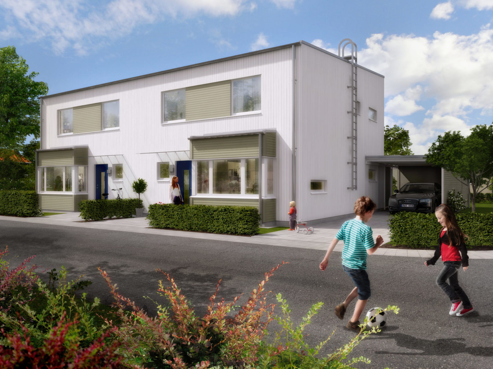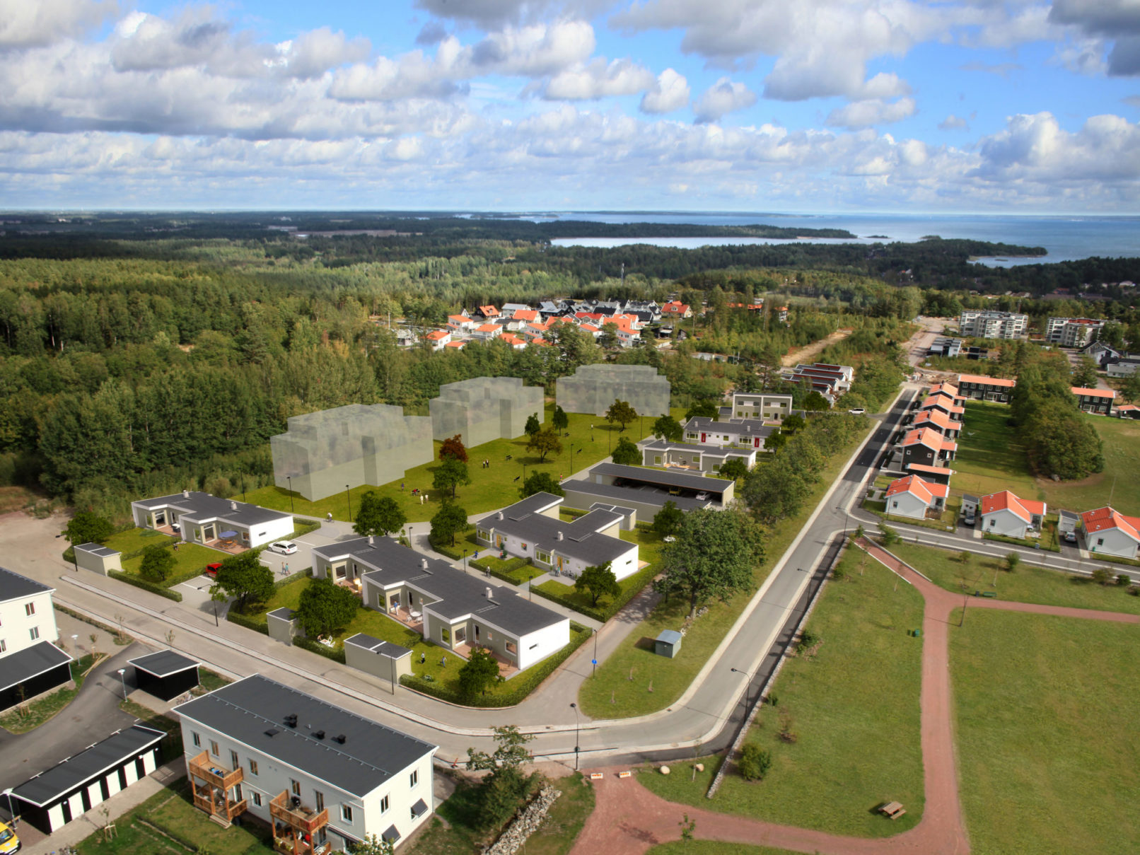 ”Området ligger nära naturen och på cykel- och gångavstånd finns golfbana, havsbad och elljusspår. Tvärs över gatan ligger en fin lekplats med intilliggande naturområde och dagis finns också på nära håll.” Vi har velat ta till vara tomtens goda väderstreck och dess möjlighet till både utblickar och ett inre samlande rum. I norr och öster har vi tänkt oss en rygg av flerbostadshus i 3 våningar, med en 4:e indragen takvåning. Husen öppnar sig i stora generösa balkonger mot söder- och västersolen och tomtens inre parkrum. Som en krans omfamnande detta parkrum strålar radhuslängor innehållande 2 eller 3 enheter ut mot omgivningen. Alla radhuslägenheter har uteplatser i väster och en egen liten täppa.