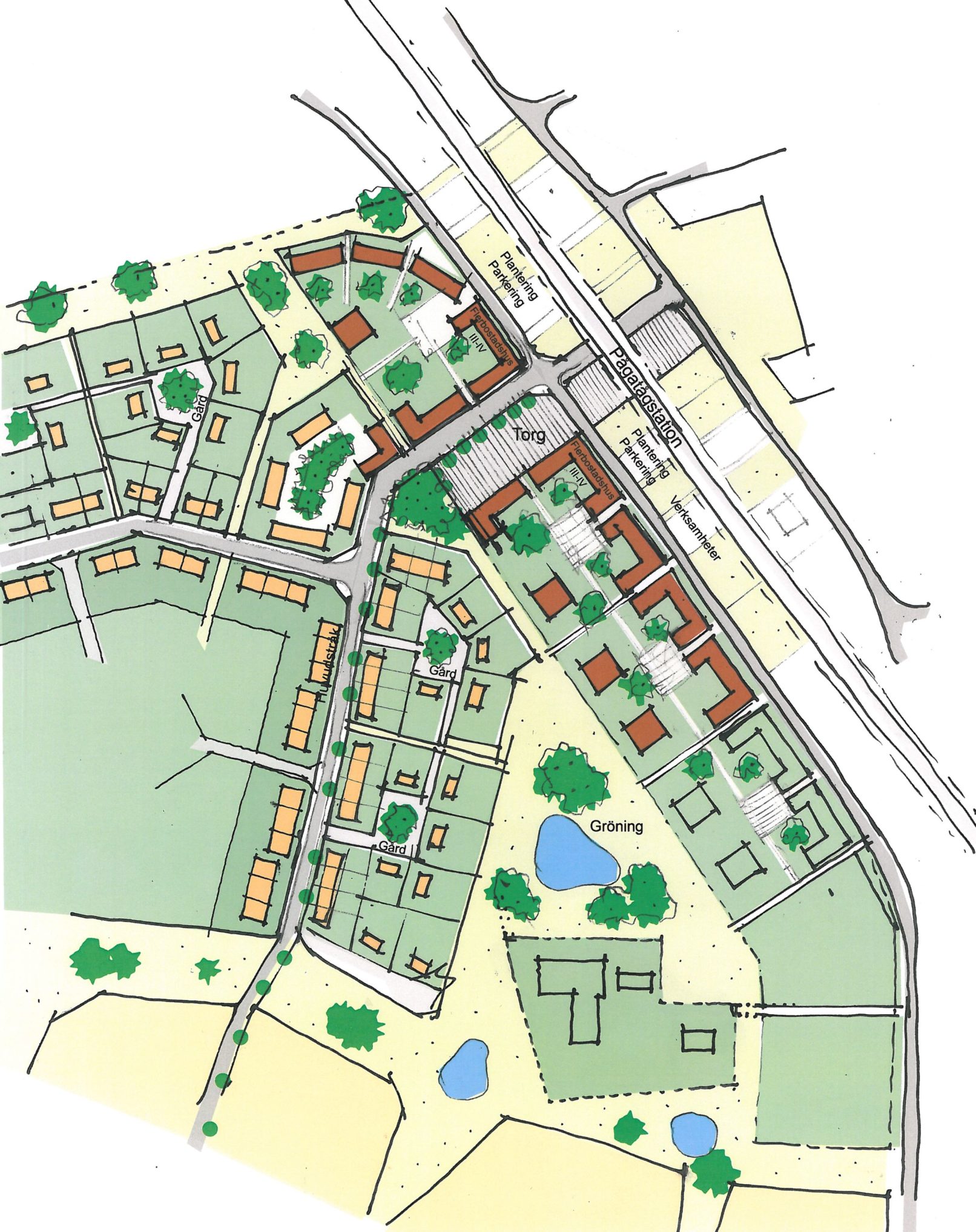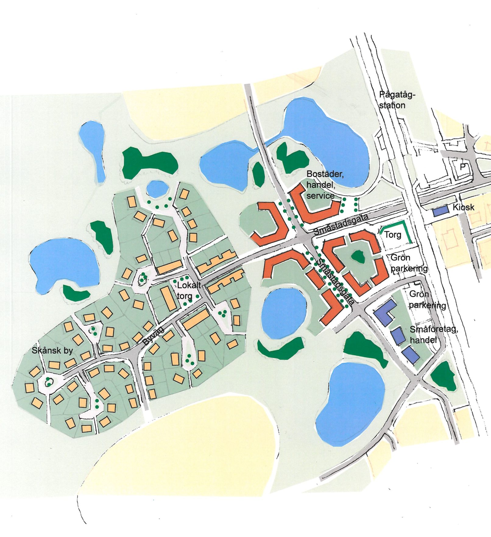 1. Omedelbart väster om pågatågsstationen föreslås småstadsmässiga flerbostadshus i anslutning till ett stationstorg. Mot sydväst sker på motsvarande sätt som i Västra Ingelstad, en utbyggnad av radhus, parhus och friliggande småhus i ”byar” kring slingrande bygator, åtskilda av gröna stråk och landskapsflikar. Bebyggelsen får anslutning till ett 10-tal mindre vattendammar. En bondgård integreras i ett av grönområdena.